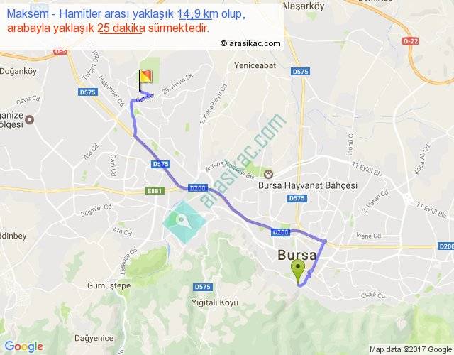Maksem - Hamitler arası yaklaşık olarak 90 km/h ile yukarıda belirtilen sürede olup, iki yerin kuş uçuşu uzaklığı (mesafesi) 10'dir. Yolculuk otobüsle 32 dakika sürmektedir.