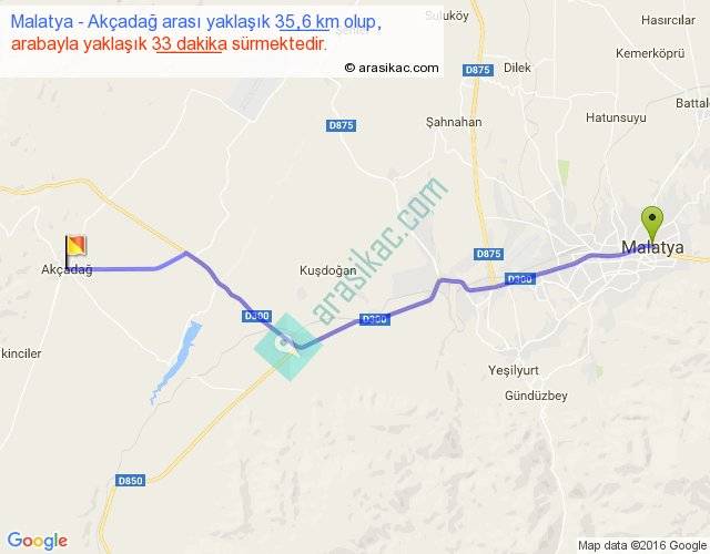 Malatya - Akçadağ arası yaklaşık olarak 90 km/h ile yukarıda belirtilen sürede olup, iki yerin kuş uçuşu uzaklığı (mesafesi) 31'dir. Yolculuk otobüsle 42 dakika sürmektedir.