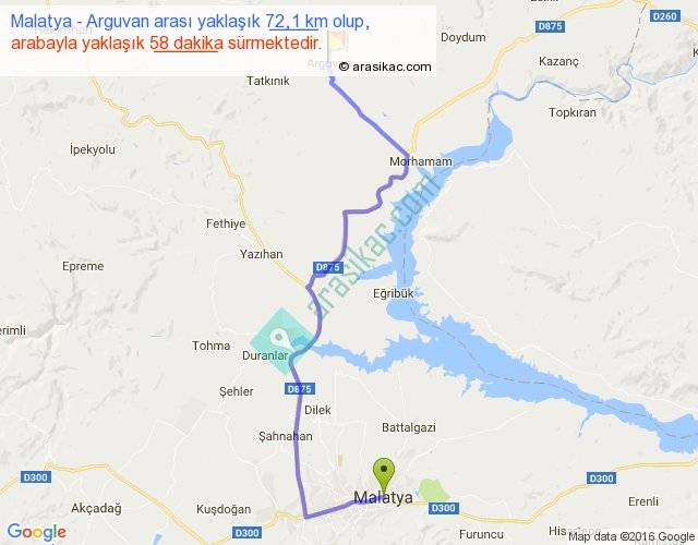 Malatya - Arguvan arası yaklaşık olarak 90 km/h ile yukarıda belirtilen sürede olup, iki yerin kuş uçuşu uzaklığı (mesafesi) 48'dir. Yolculuk otobüsle 1 saat 15 dakika sürmektedir.