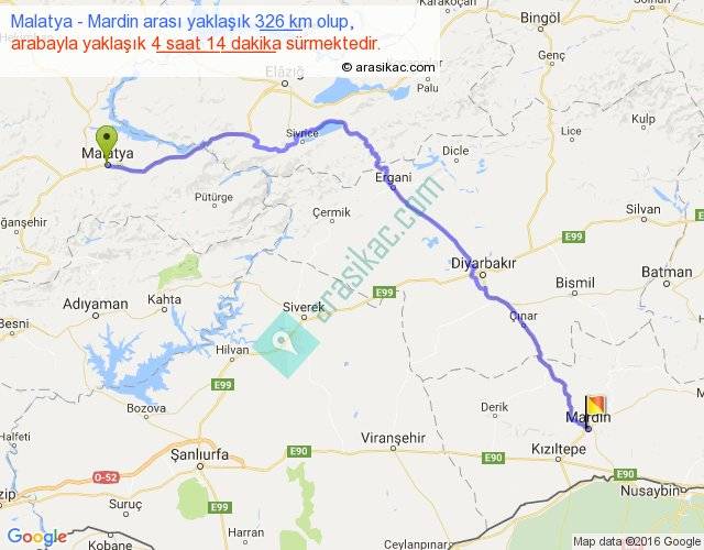Malatya - Mardin arası yaklaşık olarak 90 km/h ile yukarıda belirtilen sürede olup, iki yerin kuş uçuşu uzaklığı (mesafesi) 239'dir. Yolculuk otobüsle 5 saat 30 dakika sürmektedir.