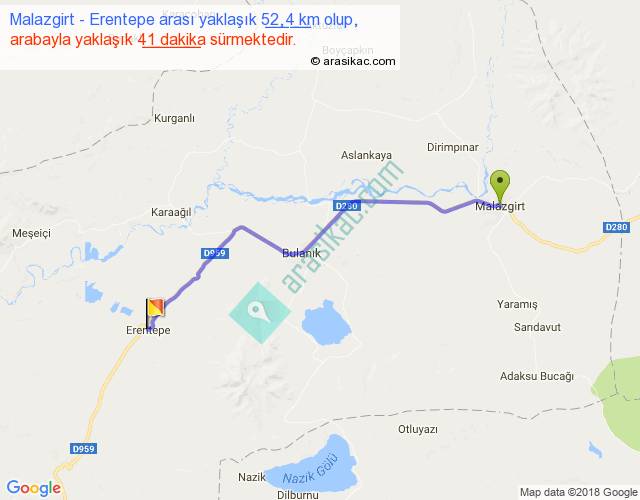 Malazgirt - Erentepe arası yaklaşık olarak 90 km/h ile yukarıda belirtilen sürede olup, iki yerin kuş uçuşu uzaklığı (mesafesi) 44'dir. Yolculuk otobüsle 53 dakika sürmektedir.