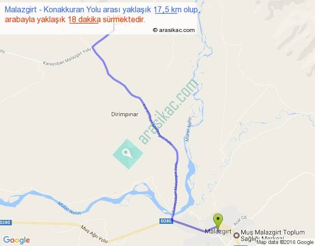 Malazgirt - Konakkuran Yolu arası yaklaşık olarak 90 km/h ile yukarıda belirtilen sürede olup, iki yerin kuş uçuşu uzaklığı (mesafesi) 14'dir. Yolculuk otobüsle 23 dakika sürmektedir.