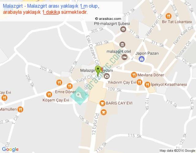 Malazgirt - Malazgirt arası yaklaşık olarak 90 km/h ile yukarıda belirtilen sürede olup, iki yerin kuş uçuşu uzaklığı (mesafesi) 0'dir. Yolculuk otobüsle 1 dakika sürmektedir.