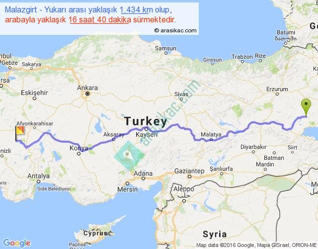 Malazgirt - Yukarı arası yaklaşık olarak 90 km/h ile yukarıda belirtilen sürede olup, iki yerin kuş uçuşu uzaklığı (mesafesi) 1108'dir. Eğer belirtilen yerler arasında uçak seferi var ise bu süre uçakla 1 saat 42 dakika'ya kadar düşebilir. Yolculuk otobüsle 21 saat 40 dakika sürmektedir.