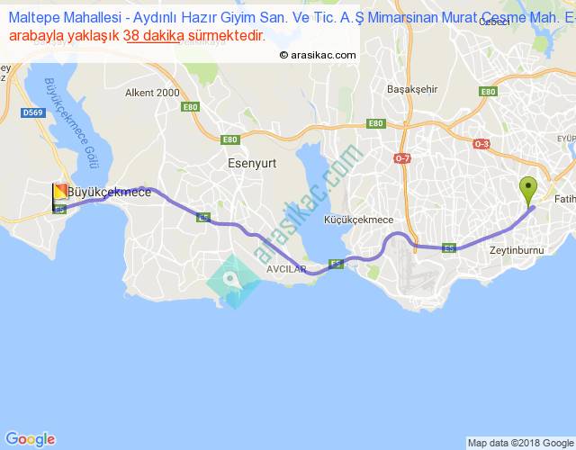Maltepe Mahallesi - Aydınlı Hazır Giyim San. Ve Tic. A.Ş Mimarsinan Murat Çeşme Mah. E-5 arası yaklaşık olarak 90 km/h ile yukarıda belirtilen sürede olup, iki yerin kuş uçuşu uzaklığı (mesafesi) 30'dir. Yolculuk otobüsle 49 dakika sürmektedir.