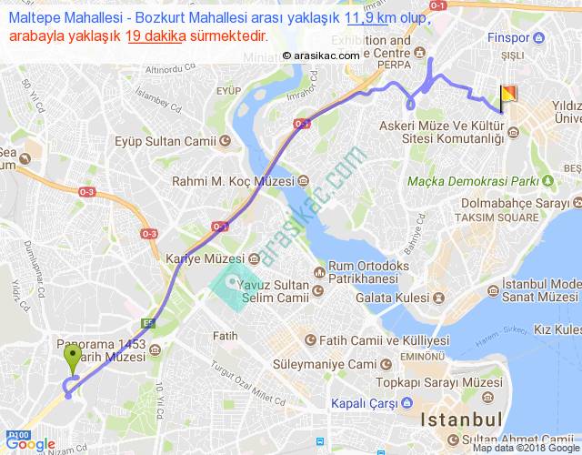 Maltepe Mahallesi - Bozkurt Mahallesi arası yaklaşık olarak 90 km/h ile yukarıda belirtilen sürede olup, iki yerin kuş uçuşu uzaklığı (mesafesi) 8'dir. Yolculuk otobüsle 24 dakika sürmektedir.