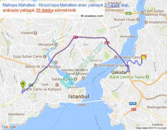 Maltepe Mahallesi - Kirazlıtepe Mahallesi arası yaklaşık olarak 90 km/h ile yukarıda belirtilen sürede olup, iki yerin kuş uçuşu uzaklığı (mesafesi) 13'dir. Yolculuk otobüsle 33 dakika sürmektedir.