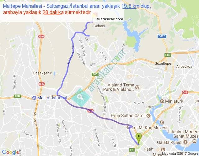 Maltepe Mahallesi - Sultangazi İstanbul arası yaklaşık olarak 90 km/h ile yukarıda belirtilen sürede olup, iki yerin kuş uçuşu uzaklığı (mesafesi) 12'dir. Yolculuk otobüsle 36 dakika sürmektedir.