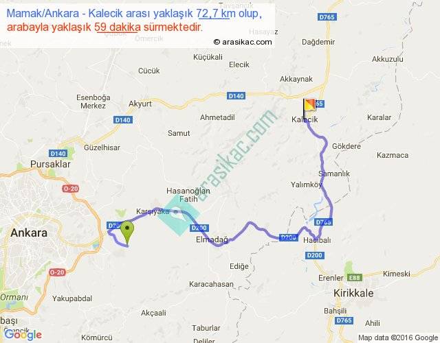 Mamak Ankara - Kalecik arası yaklaşık olarak 90 km/h ile yukarıda belirtilen sürede olup, iki yerin kuş uçuşu uzaklığı (mesafesi) 37'dir. Yolculuk otobüsle 1 saat 16 dakika sürmektedir.