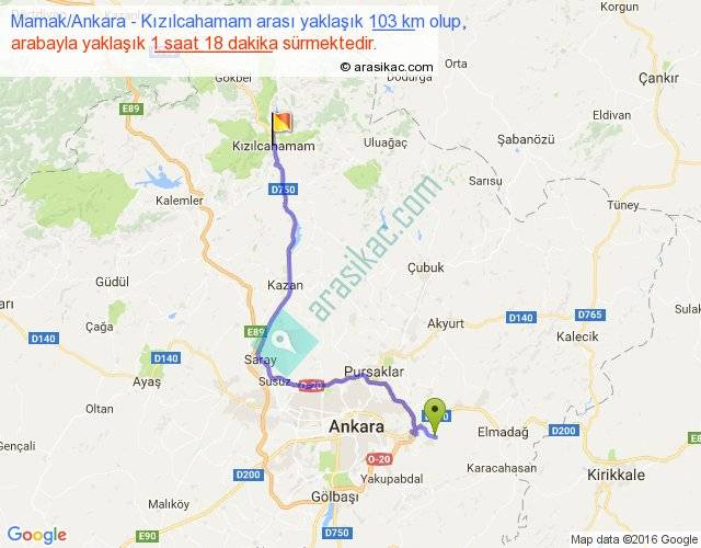 Mamak Ankara - Kızılcahamam arası yaklaşık olarak 90 km/h ile yukarıda belirtilen sürede olup, iki yerin kuş uçuşu uzaklığı (mesafesi) 71'dir. Yolculuk otobüsle 1 saat 41 dakika sürmektedir.