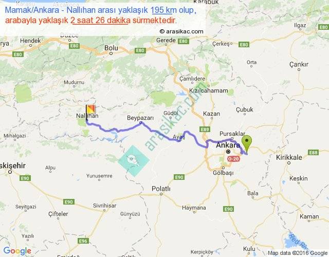 Mamak Ankara - Nallıhan arası yaklaşık olarak 90 km/h ile yukarıda belirtilen sürede olup, iki yerin kuş uçuşu uzaklığı (mesafesi) 148'dir. Yolculuk otobüsle 3 saat 9 dakika sürmektedir.