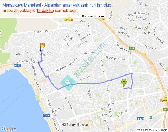 Manavkuyu Mahallesi - Alparslan arası yaklaşık olarak 90 km/h ile yukarıda belirtilen sürede olup, iki yerin kuş uçuşu uzaklığı (mesafesi) 3'dir. Yolculuk otobüsle 16 dakika sürmektedir.