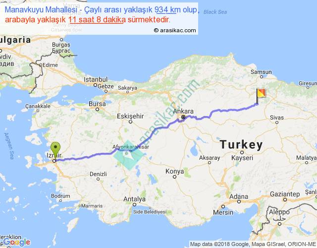 Manavkuyu Mahallesi - Çaylı arası yaklaşık olarak 90 km/h ile yukarıda belirtilen sürede olup, iki yerin kuş uçuşu uzaklığı (mesafesi) 794'dir. Eğer belirtilen yerler arasında uçak seferi var ise bu süre uçakla 1 saat 13 dakika'ya kadar düşebilir. Yolculuk otobüsle 14 saat 28 dakika sürmektedir.