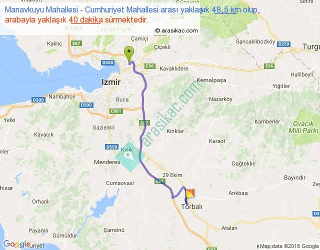 Manavkuyu Mahallesi - Cumhuriyet Mahallesi arası yaklaşık olarak 90 km/h ile yukarıda belirtilen sürede olup, iki yerin kuş uçuşu uzaklığı (mesafesi) 36'dir. Yolculuk otobüsle 52 dakika sürmektedir.