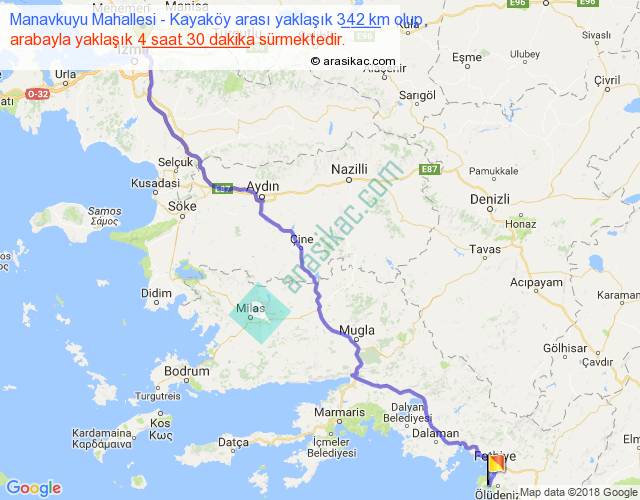 Manavkuyu Mahallesi - Kayaköy arası yaklaşık olarak 90 km/h ile yukarıda belirtilen sürede olup, iki yerin kuş uçuşu uzaklığı (mesafesi) 267'dir. Eğer belirtilen yerler arasında uçak seferi var ise bu süre uçakla 24 dakika'ya kadar düşebilir. Yolculuk otobüsle 5 saat 51 dakika sürmektedir.
