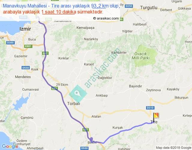 Manavkuyu Mahallesi - Tire arası yaklaşık olarak 90 km/h ile yukarıda belirtilen sürede olup, iki yerin kuş uçuşu uzaklığı (mesafesi) 62'dir. Yolculuk otobüsle 1 saat 31 dakika sürmektedir.