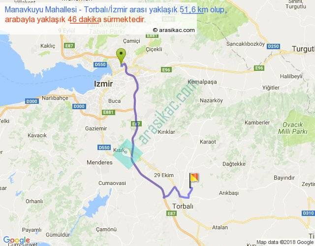 Manavkuyu Mahallesi - Torbalı İzmir arası yaklaşık olarak 90 km/h ile yukarıda belirtilen sürede olup, iki yerin kuş uçuşu uzaklığı (mesafesi) 34'dir. Yolculuk otobüsle 59 dakika sürmektedir.