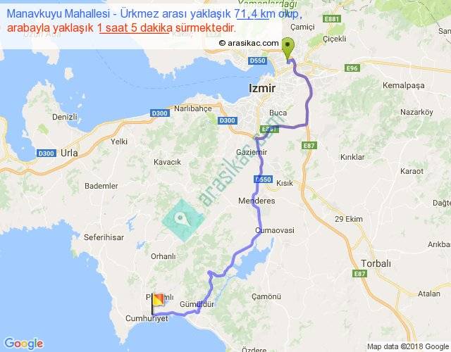 Manavkuyu Mahallesi - Ürkmez arası yaklaşık olarak 90 km/h ile yukarıda belirtilen sürede olup, iki yerin kuş uçuşu uzaklığı (mesafesi) 48'dir. Yolculuk otobüsle 1 saat 24 dakika sürmektedir.