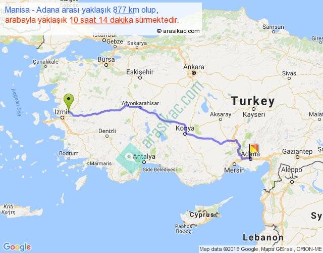 Manisa - Adana arası yaklaşık olarak 90 km/h ile yukarıda belirtilen sürede olup, iki yerin kuş uçuşu uzaklığı (mesafesi) 713'dir. Eğer belirtilen yerler arasında uçak seferi var ise bu süre uçakla 1 saat 05 dakika'ya kadar düşebilir. Yolculuk otobüsle 13 saat 18 dakika sürmektedir.