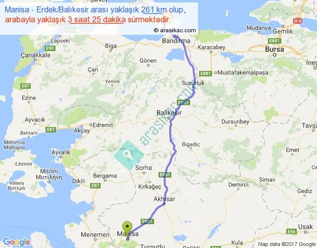 Manisa - Erdek Balıkesir arası yaklaşık olarak 90 km/h ile yukarıda belirtilen sürede olup, iki yerin kuş uçuşu uzaklığı (mesafesi) 205'dir. Yolculuk otobüsle 4 saat 26 dakika sürmektedir.