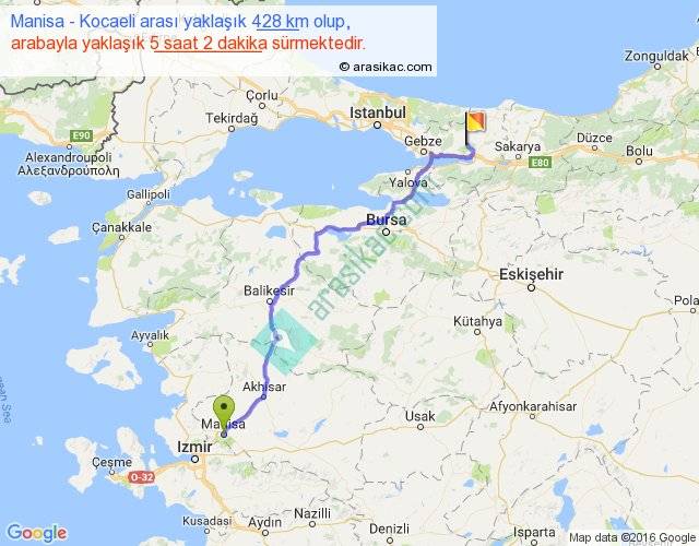 Manisa - Kocaeli arası yaklaşık olarak 90 km/h ile yukarıda belirtilen sürede olup, iki yerin kuş uçuşu uzaklığı (mesafesi) 324'dir. Eğer belirtilen yerler arasında uçak seferi var ise bu süre uçakla 29 dakika'ya kadar düşebilir. Yolculuk otobüsle 6 saat 32 dakika sürmektedir.
