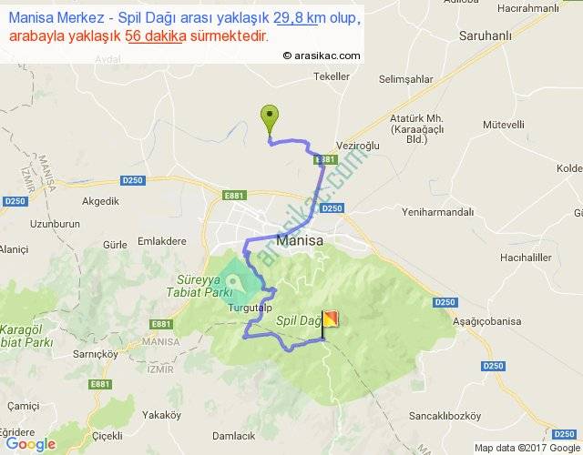 Manisa Merkez - Spil Dağı arası yaklaşık olarak 90 km/h ile yukarıda belirtilen sürede olup, iki yerin kuş uçuşu uzaklığı (mesafesi) 14'dir. Yolculuk otobüsle 1 saat 12 dakika sürmektedir.