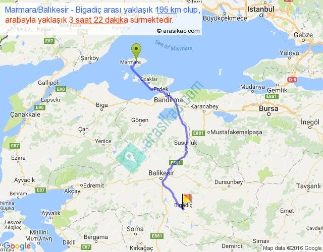 Marmara Balıkesir - Bigadiç arası yaklaşık olarak 90 km/h ile yukarıda belirtilen sürede olup, iki yerin kuş uçuşu uzaklığı (mesafesi) 143'dir. Yolculuk otobüsle 4 saat 22 dakika sürmektedir.