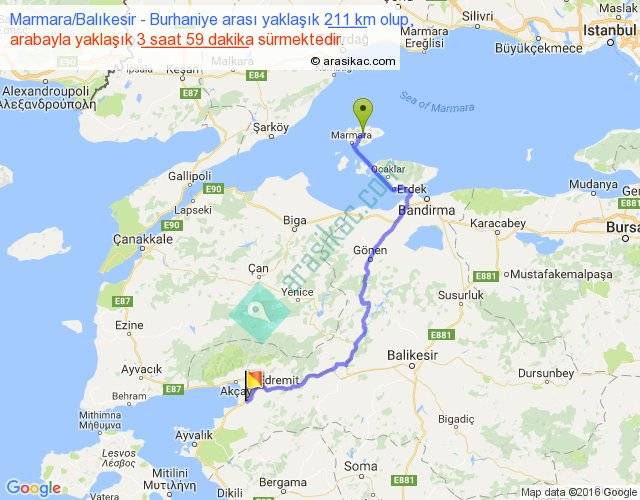 Marmara Balıkesir - Burhaniye arası yaklaşık olarak 90 km/h ile yukarıda belirtilen sürede olup, iki yerin kuş uçuşu uzaklığı (mesafesi) 136'dir. Yolculuk otobüsle 5 saat 10 dakika sürmektedir.