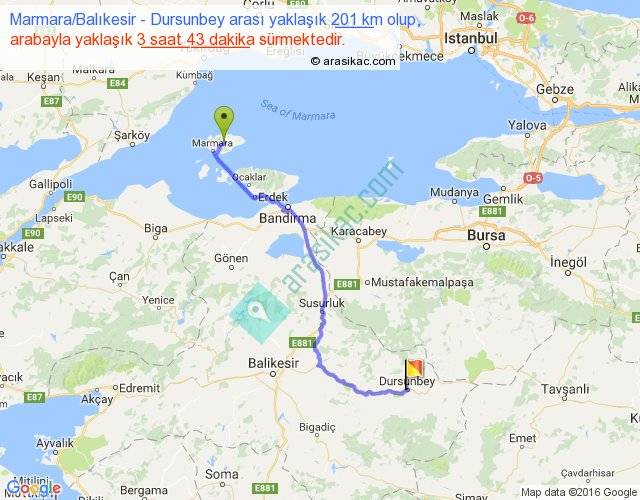 Marmara Balıkesir - Dursunbey arası yaklaşık olarak 90 km/h ile yukarıda belirtilen sürede olup, iki yerin kuş uçuşu uzaklığı (mesafesi) 143'dir. Yolculuk otobüsle 4 saat 49 dakika sürmektedir.