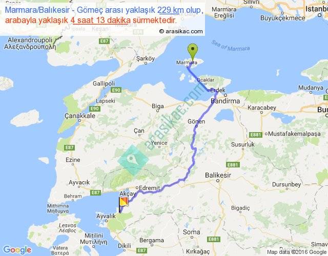 Marmara Balıkesir - Gömeç arası yaklaşık olarak 90 km/h ile yukarıda belirtilen sürede olup, iki yerin kuş uçuşu uzaklığı (mesafesi) 152'dir. Yolculuk otobüsle 5 saat 28 dakika sürmektedir.