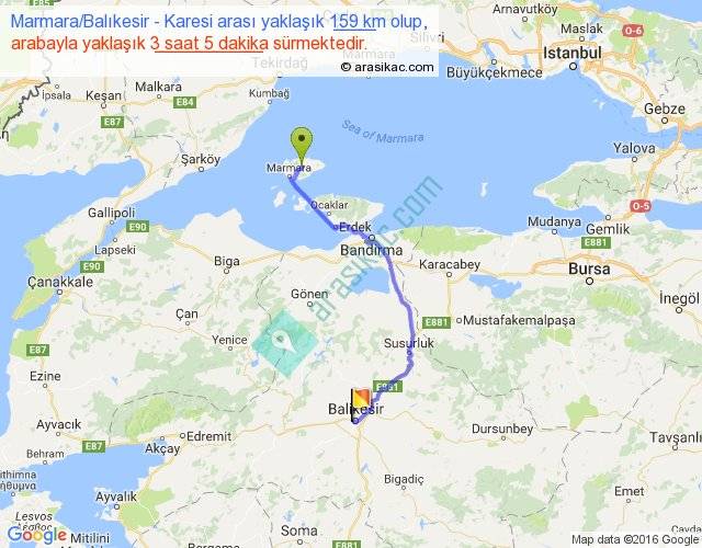 Marmara Balıkesir - Karesi arası yaklaşık olarak 90 km/h ile yukarıda belirtilen sürede olup, iki yerin kuş uçuşu uzaklığı (mesafesi) 110'dir. Yolculuk otobüsle 4 saat 0 dakika sürmektedir.
