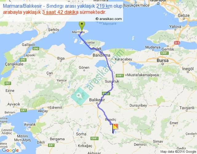 Marmara Balıkesir - Sındırgı arası yaklaşık olarak 90 km/h ile yukarıda belirtilen sürede olup, iki yerin kuş uçuşu uzaklığı (mesafesi) 160'dir. Yolculuk otobüsle 4 saat 48 dakika sürmektedir.