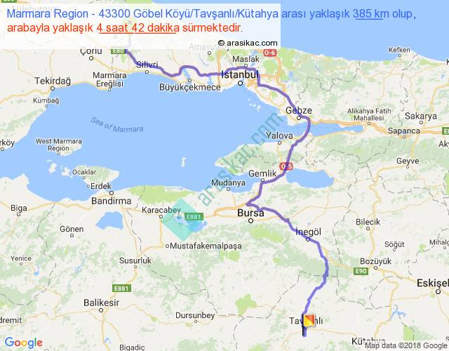 Marmara Region - 43300 Göbel Köyü Tavşanlı Kütahya arası yaklaşık olarak 90 km/h ile yukarıda belirtilen sürede olup, iki yerin kuş uçuşu uzaklığı (mesafesi) 226'dir. Yolculuk otobüsle 6 saat 6 dakika sürmektedir.