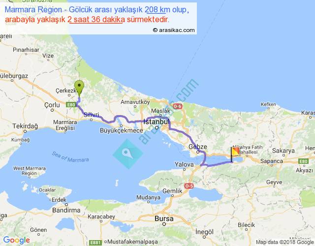 Marmara Region - Gölcük arası yaklaşık olarak 90 km/h ile yukarıda belirtilen sürede olup, iki yerin kuş uçuşu uzaklığı (mesafesi) 154'dir. Yolculuk otobüsle 3 saat 22 dakika sürmektedir.