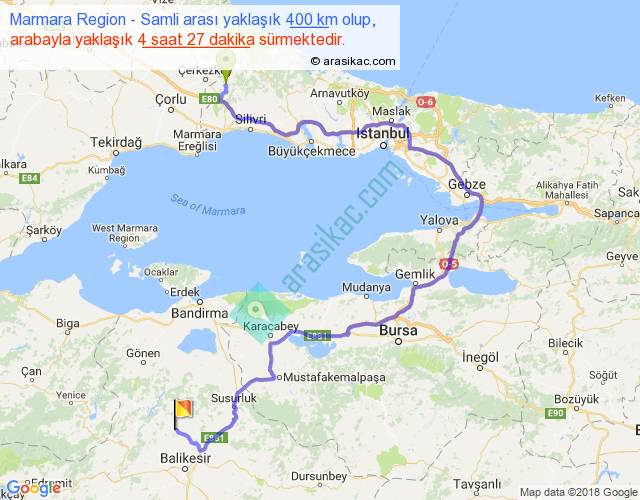 Marmara Region - Samli arası yaklaşık olarak 90 km/h ile yukarıda belirtilen sürede olup, iki yerin kuş uçuşu uzaklığı (mesafesi) 161'dir. Yolculuk otobüsle 5 saat 47 dakika sürmektedir.