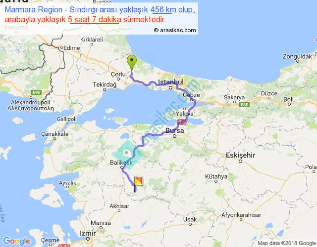 Marmara Region - Sındırgı arası yaklaşık olarak 90 km/h ile yukarıda belirtilen sürede olup, iki yerin kuş uçuşu uzaklığı (mesafesi) 223'dir. Yolculuk otobüsle 6 saat 39 dakika sürmektedir.