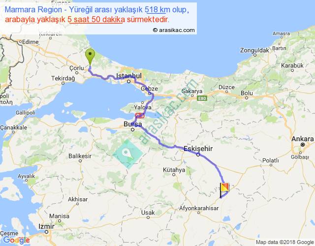 Marmara Region - Yüreğil arası yaklaşık olarak 90 km/h ile yukarıda belirtilen sürede olup, iki yerin kuş uçuşu uzaklığı (mesafesi) 349'dir. Eğer belirtilen yerler arasında uçak seferi var ise bu süre uçakla 32 dakika'ya kadar düşebilir. Yolculuk otobüsle 7 saat 35 dakika sürmektedir.