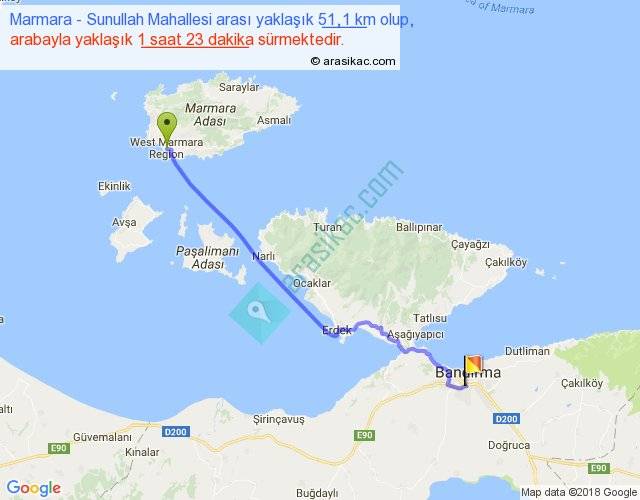 Marmara - Sunullah Mahallesi arası yaklaşık olarak 90 km/h ile yukarıda belirtilen sürede olup, iki yerin kuş uçuşu uzaklığı (mesafesi) 44'dir. Yolculuk otobüsle 1 saat 47 dakika sürmektedir.