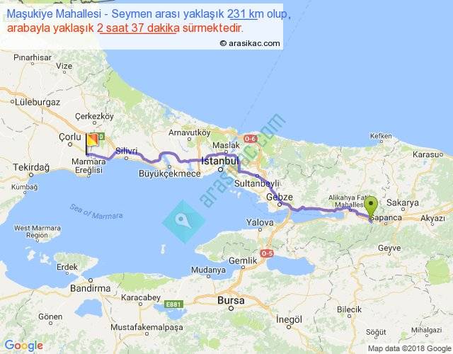 Maşukiye Mahallesi - Seymen arası yaklaşık olarak 90 km/h ile yukarıda belirtilen sürede olup, iki yerin kuş uçuşu uzaklığı (mesafesi) 189'dir. Yolculuk otobüsle 3 saat 24 dakika sürmektedir.