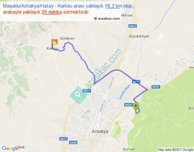 Maşuklu Antakya Hatay - Karlısu arası yaklaşık olarak 90 km/h ile yukarıda belirtilen sürede olup, iki yerin kuş uçuşu uzaklığı (mesafesi) 11'dir. Yolculuk otobüsle 33 dakika sürmektedir.