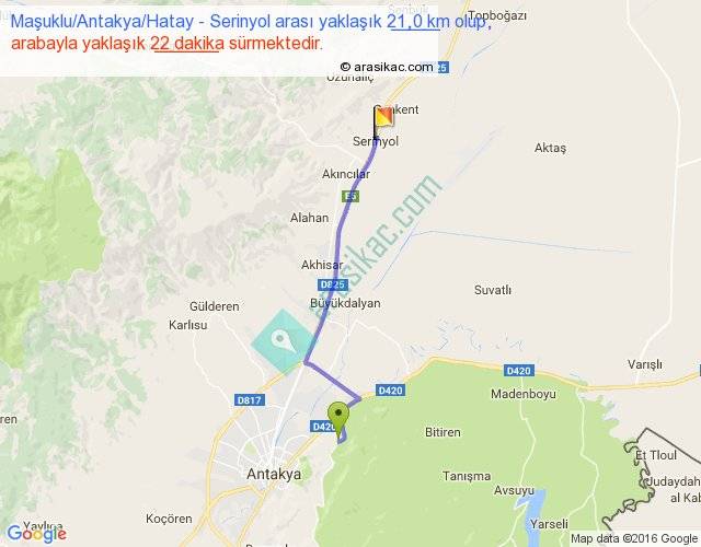 Maşuklu Antakya Hatay - Serinyol arası yaklaşık olarak 90 km/h ile yukarıda belirtilen sürede olup, iki yerin kuş uçuşu uzaklığı (mesafesi) 17'dir. Yolculuk otobüsle 28 dakika sürmektedir.