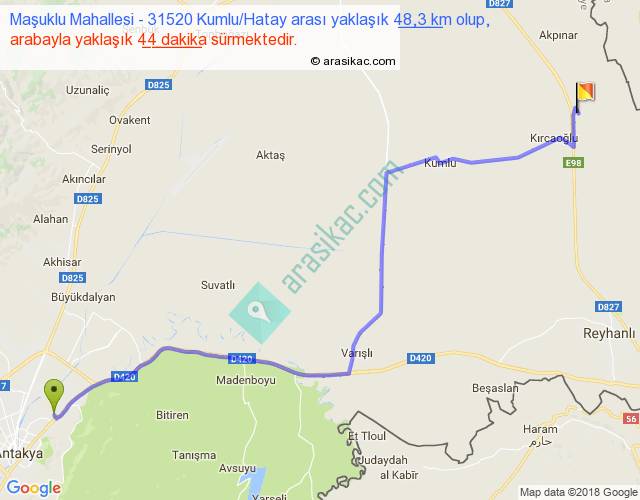 Maşuklu Mahallesi - 31520 Kumlu Hatay arası yaklaşık olarak 90 km/h ile yukarıda belirtilen sürede olup, iki yerin kuş uçuşu uzaklığı (mesafesi) 37'dir. Yolculuk otobüsle 57 dakika sürmektedir.