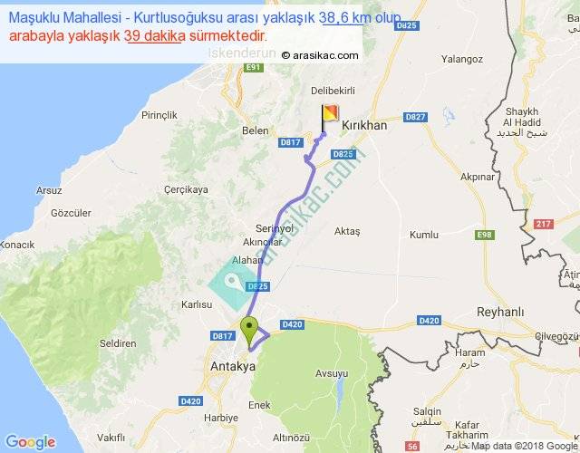 Maşuklu Mahallesi - Kurtlusoğuksu arası yaklaşık olarak 90 km/h ile yukarıda belirtilen sürede olup, iki yerin kuş uçuşu uzaklığı (mesafesi) 31'dir. Yolculuk otobüsle 50 dakika sürmektedir.