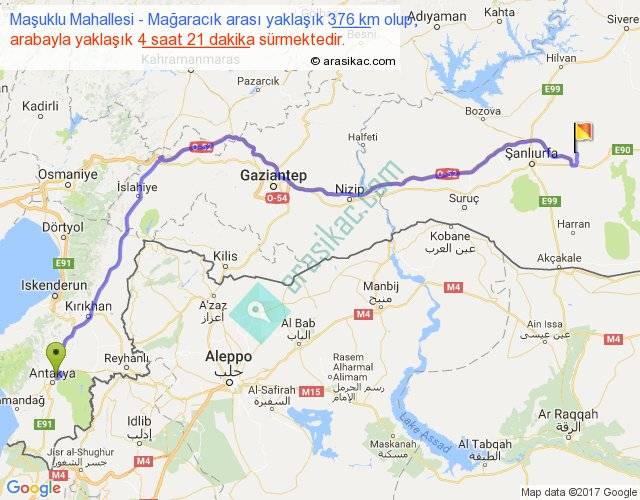 Maşuklu Mahallesi - Mağaracık arası yaklaşık olarak 90 km/h ile yukarıda belirtilen sürede olup, iki yerin kuş uçuşu uzaklığı (mesafesi) 276'dir. Eğer belirtilen yerler arasında uçak seferi var ise bu süre uçakla 25 dakika'ya kadar düşebilir. Yolculuk otobüsle 5 saat 39 dakika sürmektedir.