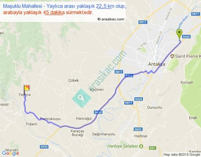 Maşuklu Mahallesi - Yaylıca arası yaklaşık olarak 90 km/h ile yukarıda belirtilen sürede olup, iki yerin kuş uçuşu uzaklığı (mesafesi) 16'dir. Yolculuk otobüsle 58 dakika sürmektedir.