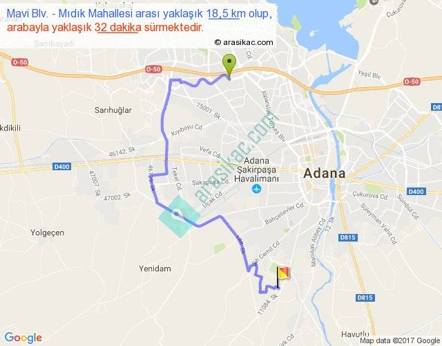 Mavi Blv. - Mıdık Mahallesi arası yaklaşık olarak 90 km/h ile yukarıda belirtilen sürede olup, iki yerin kuş uçuşu uzaklığı (mesafesi) 9'dir. Yolculuk otobüsle 41 dakika sürmektedir.
