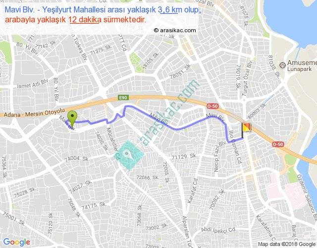 Mavi Blv. - Yeşilyurt Mahallesi arası yaklaşık olarak 90 km/h ile yukarıda belirtilen sürede olup, iki yerin kuş uçuşu uzaklığı (mesafesi) 3'dir. Yolculuk otobüsle 15 dakika sürmektedir.