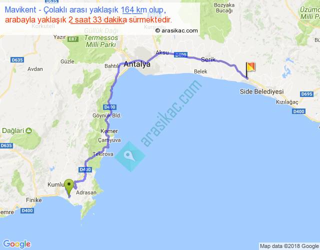 Mavikent - Çolaklı arası yaklaşık olarak 90 km/h ile yukarıda belirtilen sürede olup, iki yerin kuş uçuşu uzaklığı (mesafesi) 105'dir. Yolculuk otobüsle 3 saat 18 dakika sürmektedir.