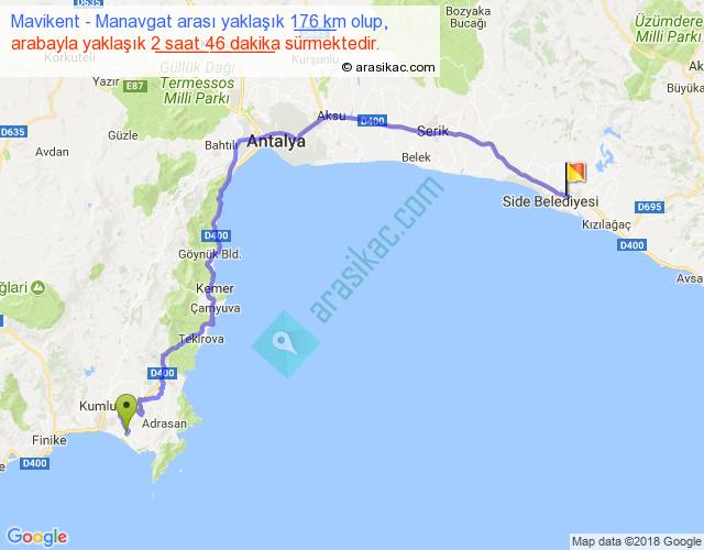 Mavikent - Manavgat arası yaklaşık olarak 90 km/h ile yukarıda belirtilen sürede olup, iki yerin kuş uçuşu uzaklığı (mesafesi) 111'dir. Yolculuk otobüsle 3 saat 35 dakika sürmektedir.