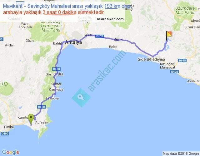 Mavikent - Sevinçköy Mahallesi arası yaklaşık olarak 90 km/h ile yukarıda belirtilen sürede olup, iki yerin kuş uçuşu uzaklığı (mesafesi) 125'dir. Yolculuk otobüsle 3 saat 54 dakika sürmektedir.